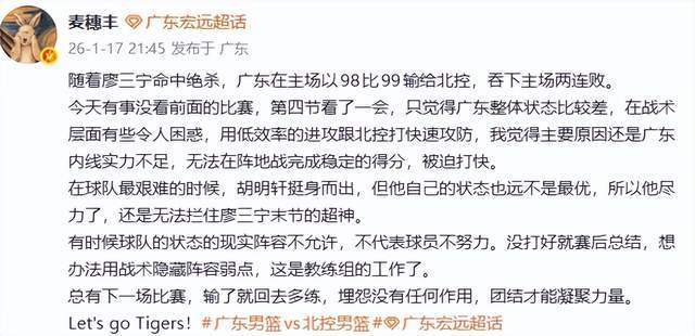 麦穗丰老师在社交平台写道:“今天有事没看前面的比赛,第四节看了一会,只觉得广东整体状态比较差,在战术层面有些令人困惑,用低效率的进攻跟北控打快速攻防,我觉得主要原因还是广东内线实力不足,无法在阵地战完成稳定的得分,被迫打快。”