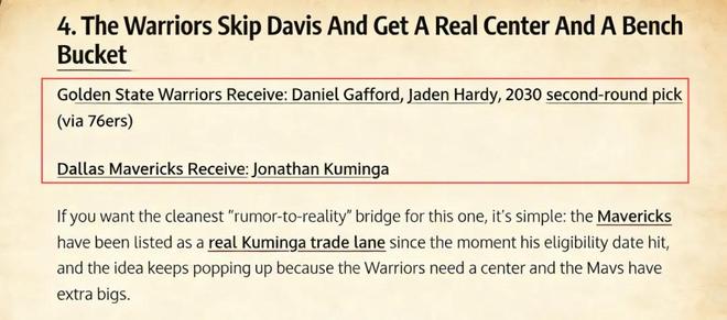 美媒《Fadeaway World》撰文建议,勇士应该将库明加交易到独行侠,换回加福德、哈迪以及2030年的次轮签。