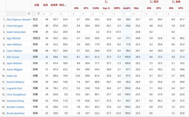 雷霆全队16人除了亚历山大三分受助攻率不足30%外,其余人都在60%以上,几位首发受助攻率更是飙到77%以上。从这一点可以看出,雷霆进攻真正有威胁的点只有亚历山大,其他人都是他的挂件帮他拉进攻空间。反观73胜勇士,库里只是一个相对有把握的得分终结点。汤普森、伊戈达拉甚至巴恩斯都能自主持球单打且每回合能拿到0.9分,虽然算不上精英持球攻击手但具备个人进攻威胁。而雷霆除了亚历山大其他人不仅没特别强持球进攻威胁,也没有足够强的单打欲望。这也是雷霆和73胜勇士进攻端最大差别。