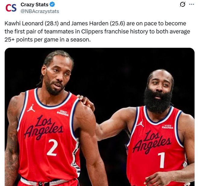 正是这样的坚持,让哈登依旧保持在高水准,本赛季场均可以拿下25.6分,小卡则场均拿下28.1分,两人有望成为快船队史首对赛季场均25+的二人组。