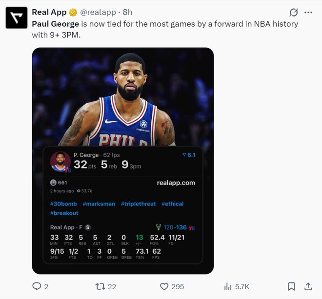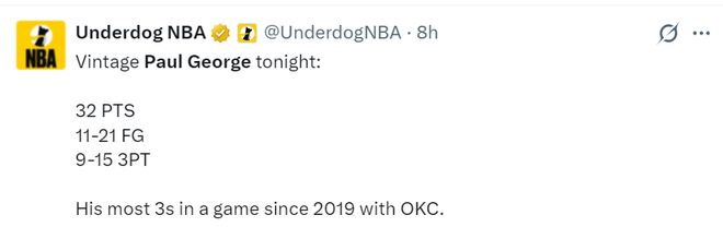 2.这是乔治自2019年雷霆时期后首次单场9+三分。(那场比赛是2019年2月2日雷霆VS热火,泡椒三分16中10拿到43分,也就是说乔治时隔2552天再度命中9+三分)