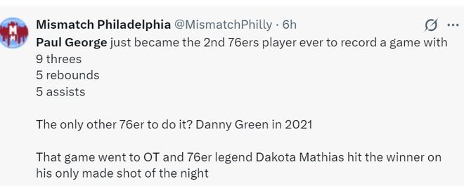 3.乔治是2021年丹尼-格林后首位单场9三分+5助攻+5篮板的费城球员;