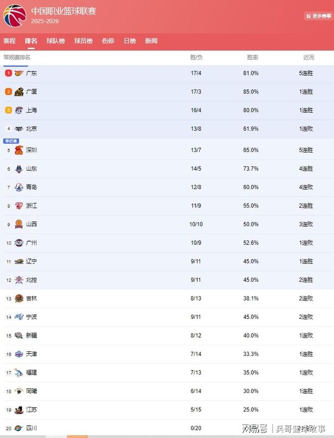 CBA排名大变!广东登顶,北京断崖下滑,广州第10辽宁难保季后赛