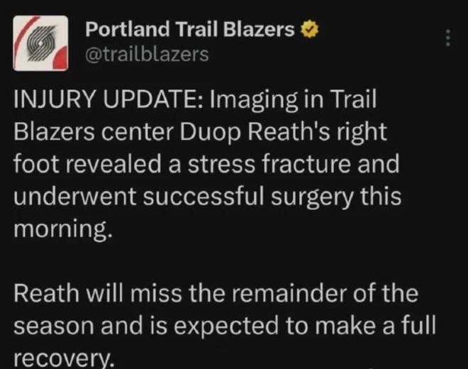 开拓者官宣:里斯应力性骨折,缺席本赛季剩余比赛,预计将完全康复。