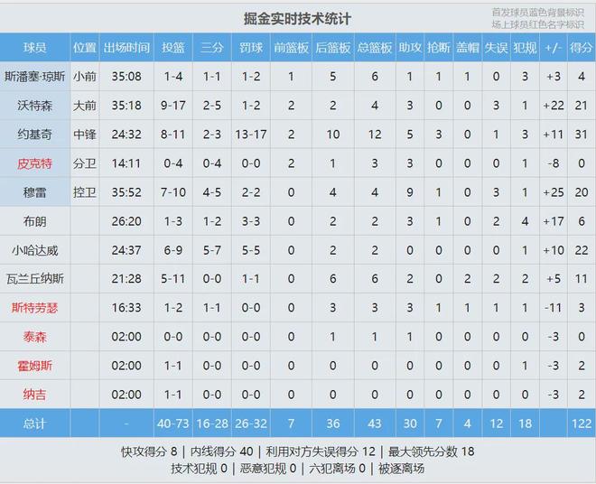 掘金3分钟还了一波13-4,再次领先到两位数。约老师背后击地秒传沃特森,后者双手暴扣。当约老师被换下场,全场球迷起立鼓掌。最终掘金122-109战胜快船,约基奇投篮11中8,三分3中2,罚球17中13,狂砍31分12板5助3断。