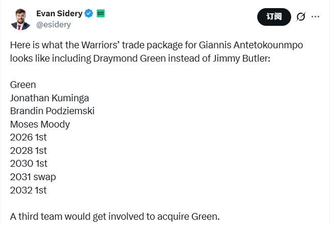 随后,名记Sidery表示,以下是勇士队用格林替代巴特勒后,为得到字母哥所准备的潜在报价:格林、库明加、波杰姆斯基、穆迪、2026年首轮签、2028年首轮签、2030年首轮签、2031年选秀权互换权、2032年首轮签。此外,这笔交易还需要第三方球队参与,来接手格林的合同。