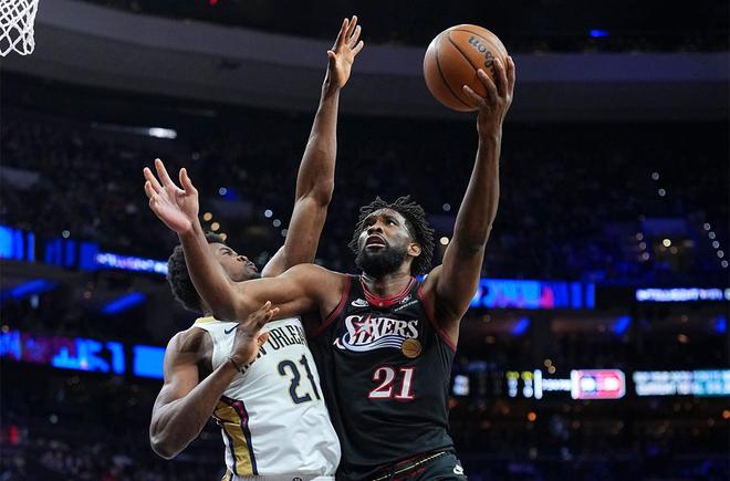 恩比德在首节得到8分,一次篮下补篮得分,另外3次中距离投篮得分。76人首节31比33落后鹈鹕2分。