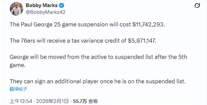 乔治本赛季年薪5167万美元,他被禁赛25场,薪资将打上折扣。ESPN薪资专家鲍比·马克斯进行了解读:“保罗·乔治因25场禁赛将损失薪资1174万美元。76人将获得587万美元的奢侈税差额返还。在第5场比赛后,乔治将从激活名单转入禁赛名单。一旦他进入禁赛名单,球队可以再签下一名球员。”