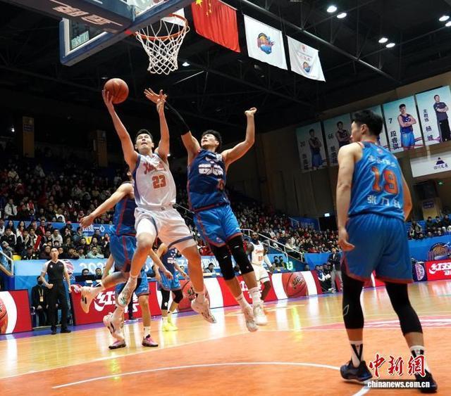 四川男篮队员景菡一(蓝衣)得到全队最高的14分,在比分落后时扛起了球队进攻重任。记者 吕杨摄