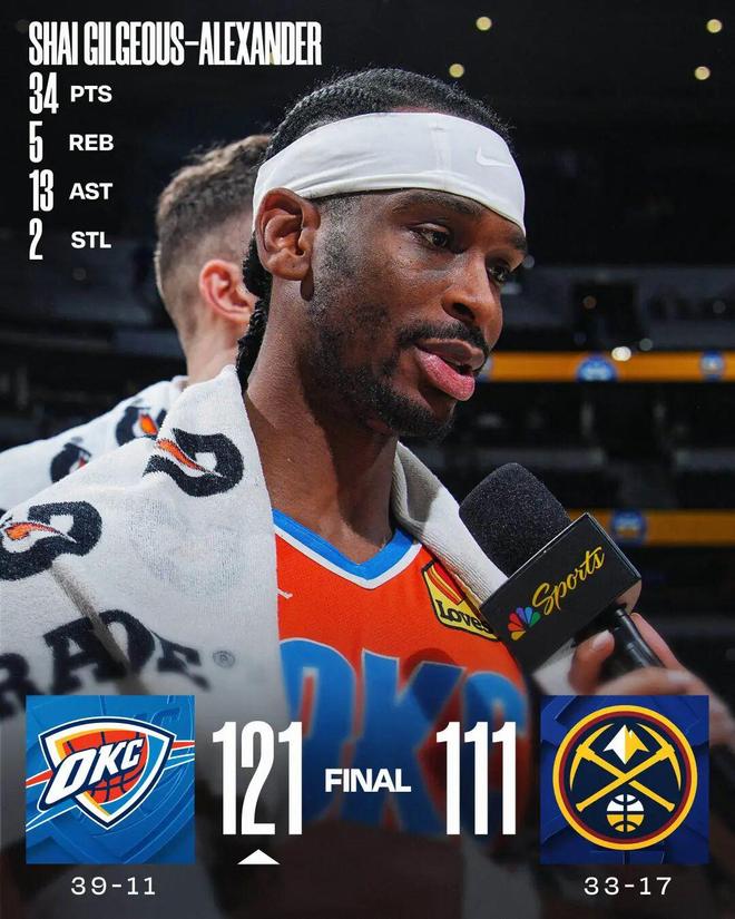 亚历山大34+13约基奇16分 雷霆胜掘金