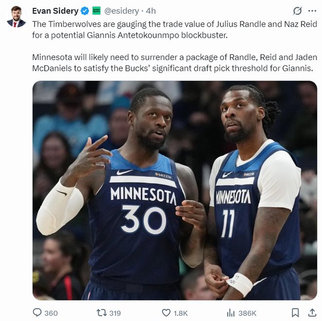 《福布斯体育》记者埃文-斯迪瑞也报道,明尼苏达森林狼也开始对字母哥竞价,为了满足雄鹿的需求,森林狼已经愿意在扬尼斯的交易中纳入里德、兰德尔、麦克丹尼尔斯等人。