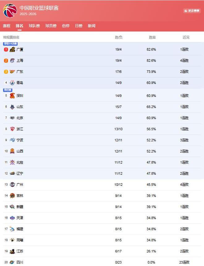CBA第一阶段最终排名:上海第1广厦第2,山东坐6望4,辽宁掉第11