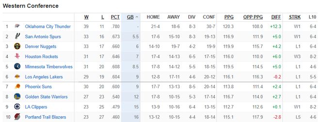 可以看到西部前四的球队只有马刺、火箭1个全明星,但马刺与火箭有着明显的区别,马刺只有文班亚马一个场均20+的球员,而火箭有两个,就连西部第六的湖人都有两个全明星。
