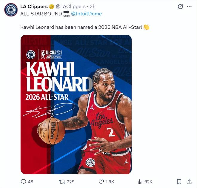 北京时间2月4日,NBA总裁萧华选择快船球星科怀-伦纳德入选全明星阵容,小卡以场均27.6分6.1篮板3.6助攻2.1抢断0.6盖帽,命中率49.7%,三分命中率39.1%。快船在西部的排名仅仅第九位。