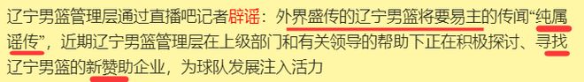辽篮也已经正式辟谣了,明确说了坊间流传的辽篮将要易主的消息纯属胡说八道,是凭空捏造的谣言,但是俱乐部正在找新赞助的确是真的。