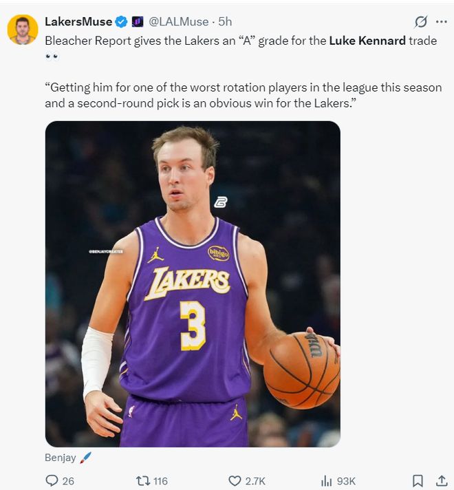 美国媒体BR为湖人交易得到肯纳德直接评A级,用本赛季表现最差的轮换球员之一以及一个次轮签就换来肯纳德,对于湖人来说无疑是一次重大的成功。