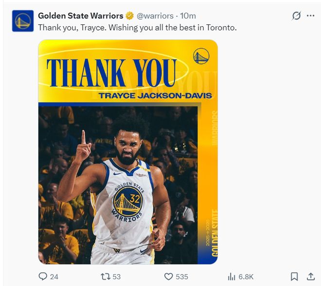 勇士官方感谢戴维斯,他被送到猛龙。
