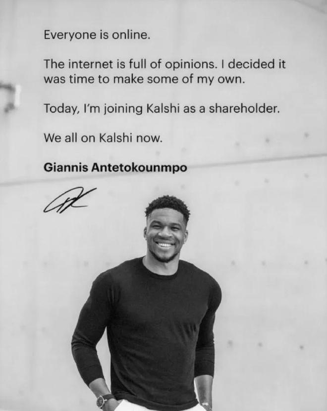 当字母哥未能在交易截止日前被雄鹿交易送走,他的未来依然存在巨大的不确定性。如今字母哥通过社媒宣布,他以股东身份加入体育预测平台Kalshi Sports,无疑是其商业版图向体育科技与竞猜领域的重要拓展。