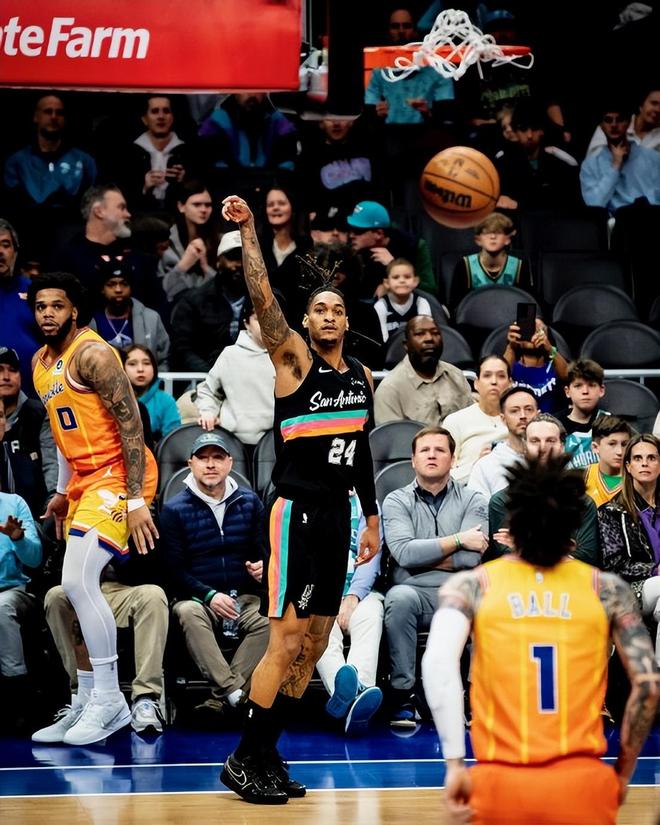 第二节果然风云突变,马刺手感骤降,黄蜂则火力全开,三球,米勒和塞克斯顿带队打出一波35-17的单节高潮。米勒单节狂砍16分,塞克斯顿从替补席杀出,连续命中三分,两人合力将半场比分拉开至14分领先。黄蜂的替补火力与首发无缝衔接,让马刺防线措手不及。下半场马刺主帅果断调整,针对性掐死米勒和三球。榜眼哈珀突然爆发,单核带队追分,一度将分差缩小至10分。进入末节,卡斯尔和巴恩斯也加入进攻潮,分差最小时仅剩2分,比赛悬念重燃。但关键时刻,马刺外线连续三次出手不中,黄蜂则稳扎稳打,通过罚球和关键防守锁住胜局。