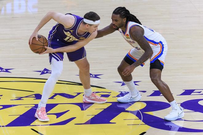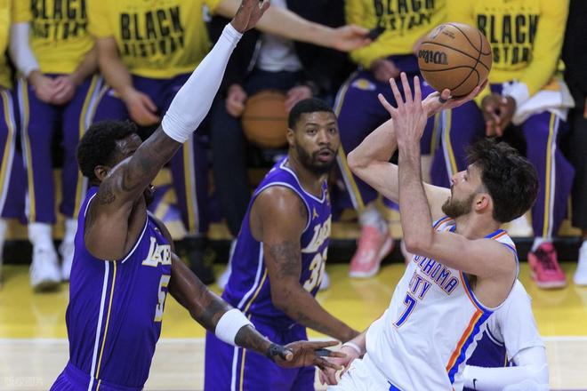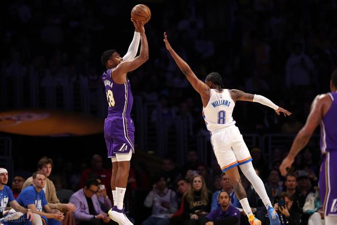 下半场易边再战,第三节上来雷霆又把分差拉开到了两位数,斯玛特三分止血,拉拉维亚三分再中,追到73-76只落后3分,雷霆暂停。回到比赛,湖人又是一波小高潮,一鼓作气成功反超队史7分8分。但雷霆并没有慌乱,而是稳扎稳打,一点点将分差抹平。里夫斯吃到技术犯规,卡鲁索顶着防守投进三分,三节结束湖人91-93落后2分。