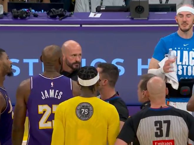 转播方给到詹姆斯与卡鲁索互喷,两人不知道在争论什么。随后杰威上篮直接飞膝撞海斯腹沟股,裁判给进攻犯规雷霆挑战,段冉:这场至少三次明显的误判、漏判不利湖人,但不会出现在裁判报告中。八村三分续命,杰威两个中投命中,詹姆斯选择三分不中,斯玛特犯规湖人无力回天。