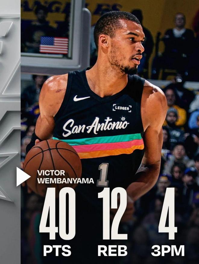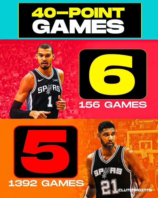 ——这是文班亚马生涯第6次40+,超越邓肯(5次),升至队史第4