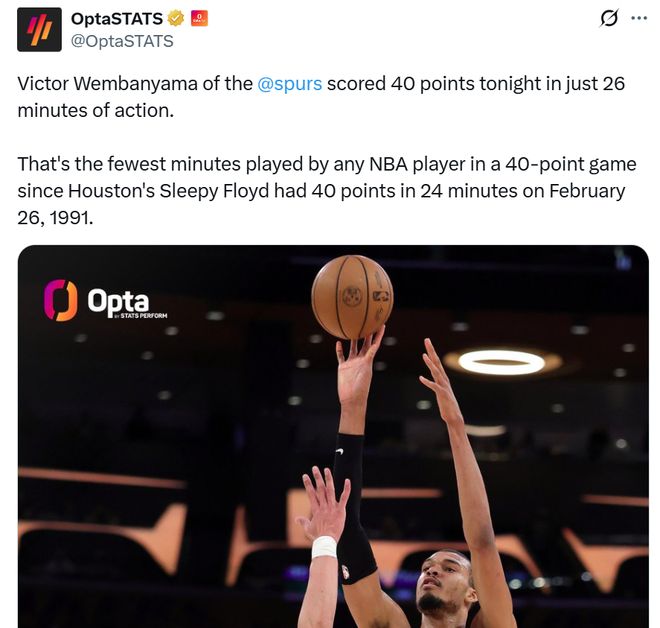 他还仅花费26分零6秒,也让文班亚马成为NBA近35年单场拿到40+得分用时最短的球员。