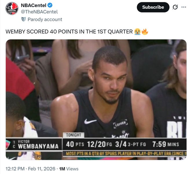 最终文班轰下40分也追平个人赛季得分纪录,并且是其生涯第6次砍下40+得分,在比邓肯少打1236场的情况下,40+场次已经超越邓肯,追平吉诺比利升至队史第4。