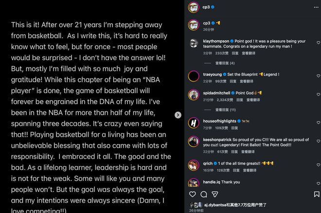 克里斯-保罗在个人社媒上发布长文、宣布正式退役,这位12届全明星、11次入选最佳阵容的“控卫之神”就此结束了漫长的廿一载征程。从初入联盟就力压“魔兽”拿下最佳新秀头衔开始,保罗作为传统一号位,以1米83的个子走出了一条属于自己的道路,生涯辗转七支球队,可以说拿到了几乎所有的个人荣誉,唯独缺了一枚总冠军戒指。