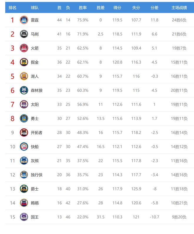 今日比赛后火箭、掘金排名互换,其他西部球队排名不变。