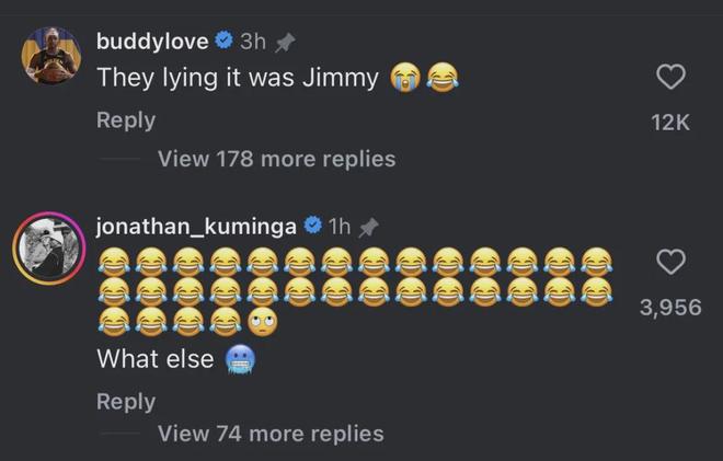 希尔德跟巴特勒私交很好,他主动替库明加解围:“他们在说谎,其实是巴特勒拿的!(笑哭的表情)”库明加回复希尔德:“还有呢?再爆料点……”库里回复库明加:“对不起了兄弟,这新闻太离谱了!去(老鹰)成为伟大吧!”