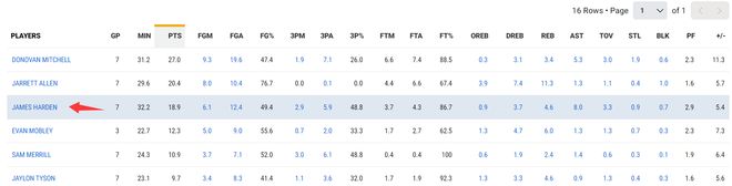 哈登加盟骑士的7场比赛6胜1负,场均32.2分钟,拿到18.9分8助攻4.6篮板0.9抢断0.7盖帽,命中率49.4%,三分命中率48.8%,罚球命中率86.7%。哈登的数据的确比在快船时下滑,可他在骑士的效率比快船高了几个档次。