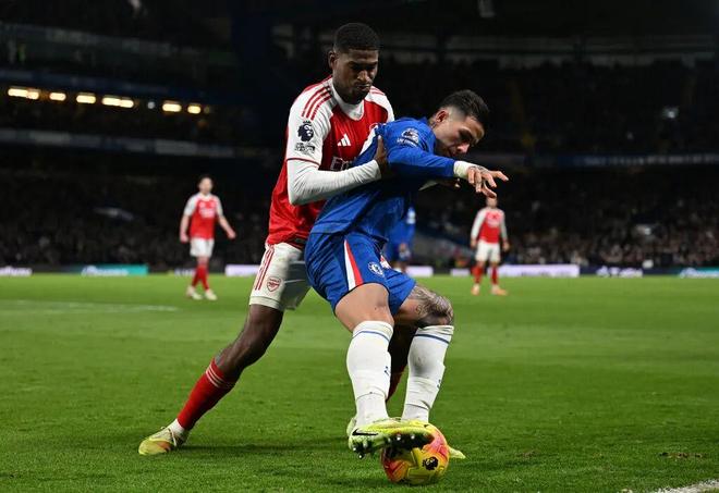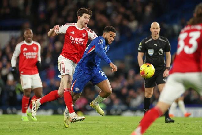 需要注意的是,对垒切尔西开场劣势,主力中卫的缺阵是个很显眼的因素,但严格来说枪手主要是输在了中前场,尤其是中场在蓝军的凶悍围猎之下有点支离破碎。赖斯依然前冲后抢很努力,但没了此前对热刺和拜仁时那种所向披靡的感觉。苏维门迪则身体对抗原本就不是强项,此役对禁区前沿的保护也有所缺失。还有连续两场参与破门的埃泽,先是在凯塞多的看守下施展不开,然后面对詹姆斯和恩佐的备用后腰组合也不占优势。