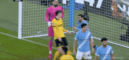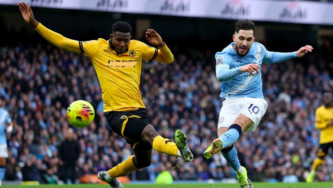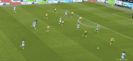 开场之后,曼城就大举压上,开启了传控的压迫性打法,狼队防守有些顾此失彼。第6分钟,努内斯边路没有任何调整,直接传球,狼队中卫准备头球解围,被马尔穆什抢先一脚,将球打进。