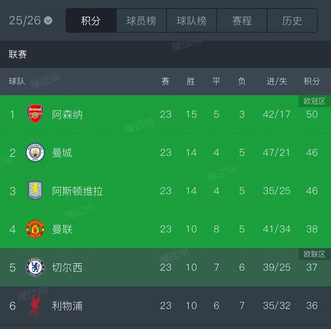 英超前六相互交锋积分榜:曼联、维拉积12分最多,阿森纳9分
