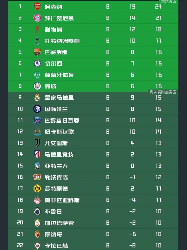 此外巴黎与纽卡原本都是同积13分,末轮2队直接交锋,结果却打成了1:1,同时跌入到附加赛区。国米虽然在客场击败了多特蒙德,但此前三连败的大坑让他们最终只能以第10名的成绩参加淘汰赛附加赛。亚特兰大和尤文末轮同样未能赢球,同样需要去参加附加赛;而最丢人现眼就是意甲冠军那不勒斯了,他们在末轮主场输给切尔西之后位列第30,堂堂意甲联赛卫冕冠军因此直接被淘汰出局;孔蒂再次立住了自己不会踢欧战的人设。