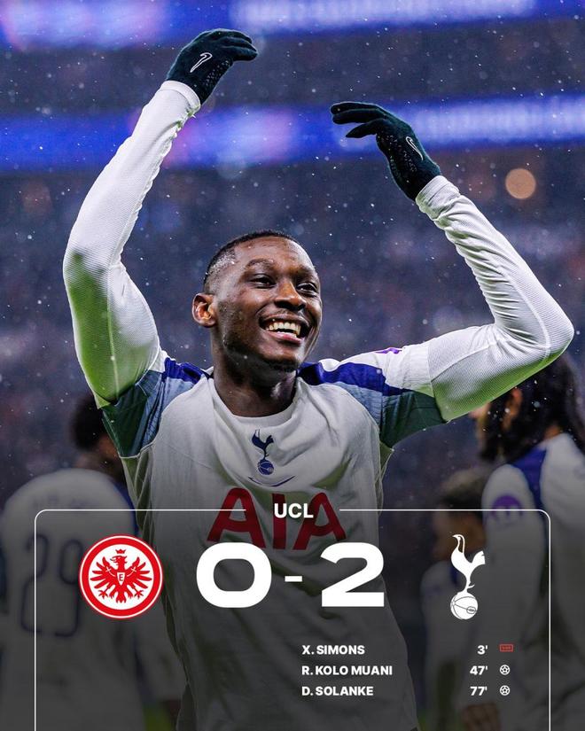 其他再场比赛,热刺延续欧冠强势表现,客场2-0击败法兰克福,以第4名锁定前八,成为英超最稳定的第二梯队代表。