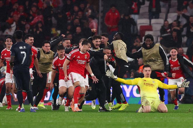 任意球开出,特鲁宾高高跃起,一记漂亮的鱼跃冲顶,将皮球顶进了球门。这不是绝杀,但却是能够让本菲卡凭借净胜球挤掉马赛挺进附加赛的救命球。而皇马掉进附加赛,附加赛的对手还是本菲卡。