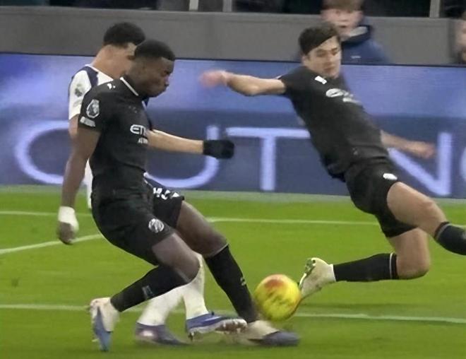 争议出现在第53分钟:热刺前锋多米尼克·索兰克在禁区内与曼城中卫马克·格伊发生身体接触,皮球随后弹入网窝。慢镜头显示,索兰克似乎从身后踢到了格伊支撑腿的后侧,导致后者失衡将球碰进自家大门。