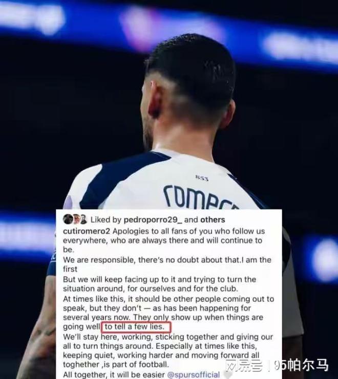 近期逼平曼城并不足以制造以下犯上的喜悦感,事实上热刺主帅弗兰克已经自我批评过:“我们的进攻不够流畅”。然而真正的“炮火”来自内部,罗梅罗在社交平台上就发泄了情绪:“我们全队只有11个人能踢球,这听起来匪夷所思,然而这是事实,也是耻辱。”