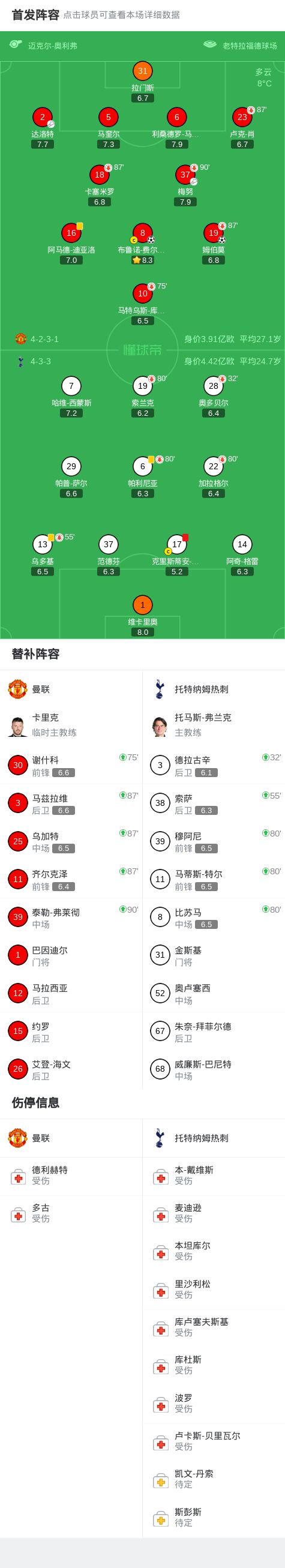 第80分钟,达洛特传中,B费门前包抄破门,曼联2-0领先热刺