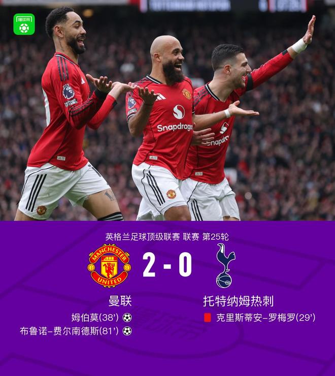 北京时间2月7日英格兰足球顶级联赛第25轮,曼联主场对阵托特纳姆热刺。上半场,罗梅罗因踩踏动作吃到红牌,之后姆伯莫破门。下半场,布鲁诺-费尔南德斯再下一城。最终比分曼联2-0热刺。