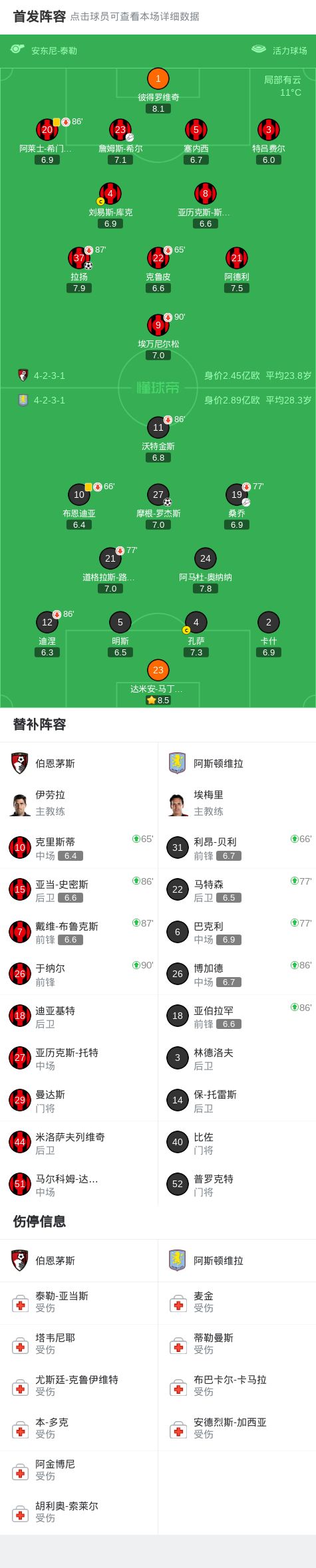 北京时间2月7日英格兰足球顶级联赛 联赛 第25轮,伯恩茅斯主场对阵阿斯顿维拉。伯恩茅斯拉扬破门。阿斯顿维拉摩根-罗杰斯破门。最终比分伯恩茅斯 1-1 阿斯顿维拉。