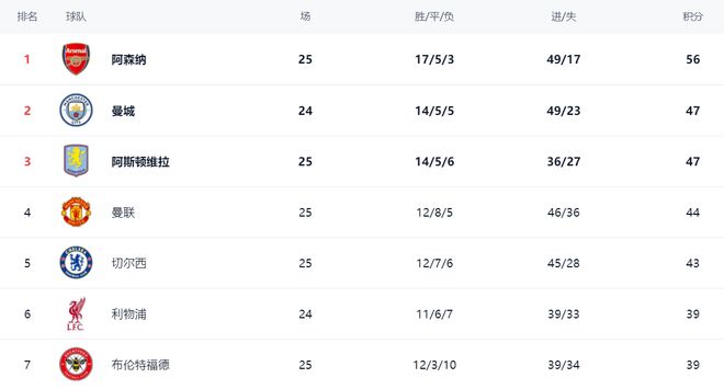 在积分榜上,阿森纳以56分排名榜首。曼城少赛一轮,依然是47分,排名第2。阿斯顿维拉只拿到一场平局,总积分也是47分,排名第3。阿森纳的领先优势足足有9分,让冠军悬念越来越小。曼联不断赢球,总积分已经达到44分,排名第4。切尔西以43分排名第5。利物浦39分排名第6。