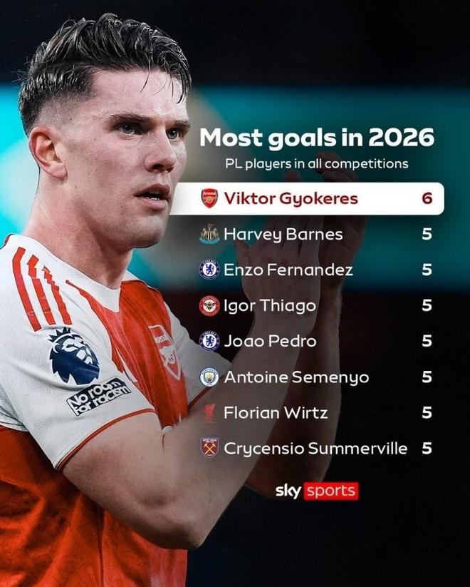 据统计,进入2026年后,约克雷斯在各项赛事中已经贡献了6球2助攻,是同期英超球员中参与进球最多的球员。