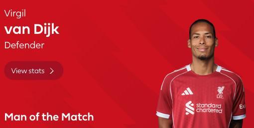打入唯一进球,范戴克当选利物浦客战桑德兰全场最佳球员