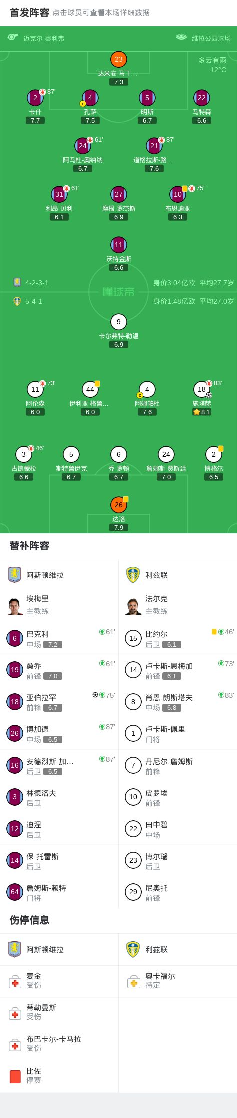 北京时间2月21日英格兰足球顶级联赛第27轮,阿斯顿维拉主场对阵利兹联。施塔赫任意球率先破门,亚伯拉罕比赛尾声扳平。最终比分阿斯顿维拉1-1利兹联。