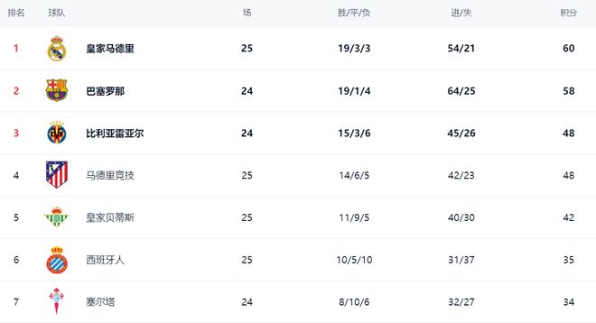 在积分榜上,皇马依然排名榜首,总积分是60分。排名第2的是巴萨,拿到58分。巴萨少赛一场的情况下落后2分。只要巴萨接下来击败莱万特,就能够登顶。比利亚雷亚尔以48分排名第3。第4的是马竞,也是48分。皇家贝蒂斯42分排名第5。