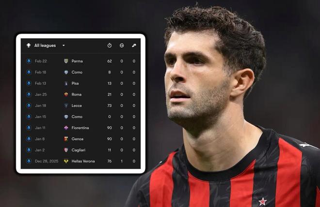 普利西奇的最后一粒进球要追溯到2025年12月28日,他在3-0战胜维罗纳的比赛中打入了第一个进球。此后美国队长受到髂腰肌滑囊炎的影响,状态一落千丈,多次错过绝佳进球机会。
